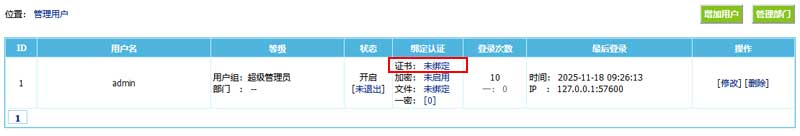| 位置2、后臺>用戶>用戶管理>修改個人資料: 登錄用戶綁定自己的登錄證書 | |
