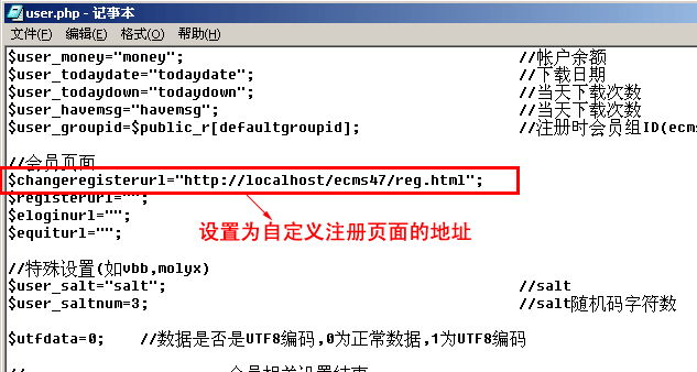 用記事本打開:e/class/user.php文件,把“$changeregisterurl”參數(shù)的值設(shè)為我們剛才自定義的注冊(cè)頁面地址,然后保存即可: