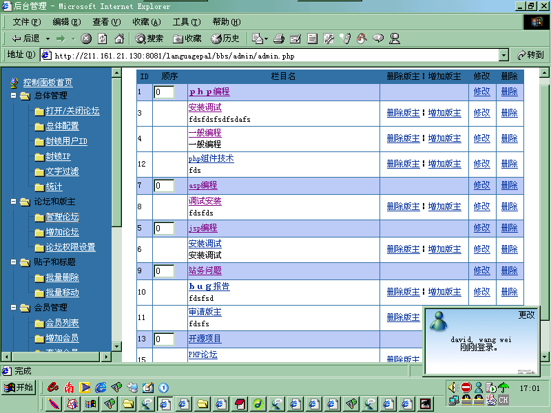 總體管理 打開/關閉論壇 總體配置 封鎖用戶ID 封鎖IP 文字過濾 統(tǒng)計 論壇和版主 管理論壇 增加論壇 論壇權限設置 貼子和標題 批量刪除 批量移動 會員管理 會員列表 增加會員 查詢會員 悄悄話管理 新聞管理 增加新聞 管理新聞 批量刪除 數據管理 備份數據庫 修復數據庫 導入數據 風格管理 模板管理 導入/導出模板 退 出