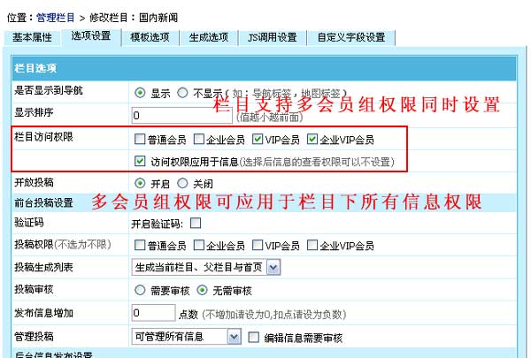 帝國(guó)CMS 6.6版欄目頁(yè)和信息內(nèi)容頁(yè)訪問權(quán)限支持限制多會(huì)員組訪問。并且保留原按權(quán)限值限制功能,用戶自行選擇,更強(qiáng)大。