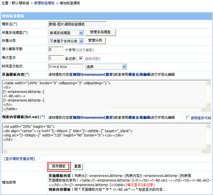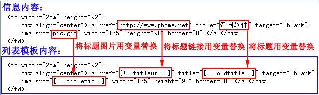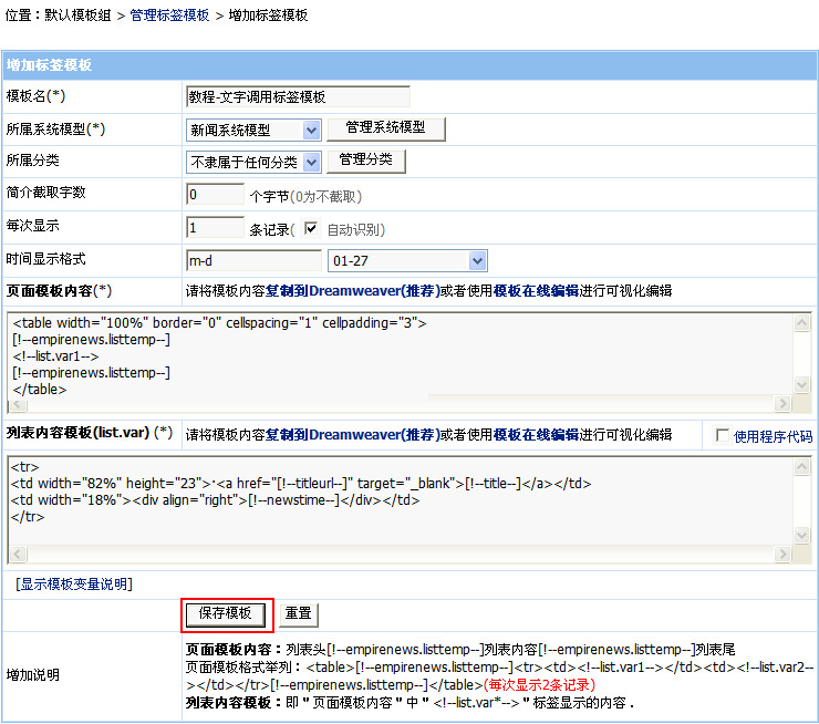 ·確定列表內(nèi)容模板:即頁面模板內(nèi)容中<!--list.var*-->表示的信息內(nèi)容代碼 |