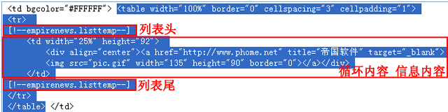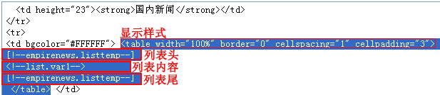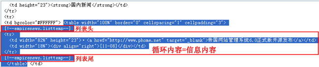 列表頭和列表尾用[!--empirenews.listtemp--]表示,是固定的,代表循環(huán)的開始和結(jié)束。