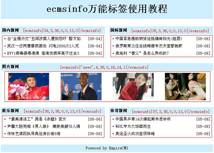 | ecmsinfo標簽與其它信息調(diào)用標簽唯一不同的是:顯示樣式由標簽?zāi)0鍥Q定。 |