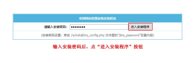 | 3、設(shè)置好安裝密碼后,刷新當(dāng)前網(wǎng)頁,并輸入安裝密碼,點(diǎn)擊【進(jìn)入安裝程序】按鈕: |