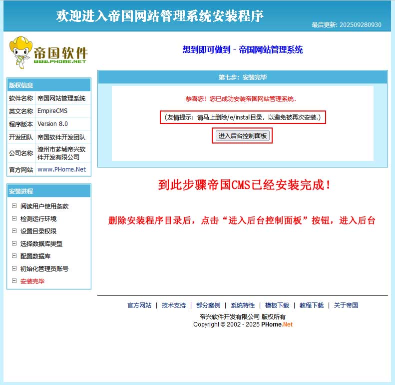 安裝完成后,請(qǐng)刪除 /e/install/ 安裝程序目錄。