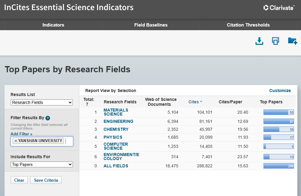 【新聞中心訊】近日,科睿唯安(Clarivate)發(fā)布的最新一期基本科學(xué)指標(biāo)數(shù)據(jù)庫(ESI)數(shù)據(jù)顯示,燕山大學(xué)物理學(xué)學(xué)科首次進(jìn)入ESI全球排名前1%行列,標(biāo)志著我校在基礎(chǔ)學(xué)科領(lǐng)域的科研實(shí)力、學(xué)術(shù)創(chuàng)新能力與國際影響力取得重大突破。至此,燕山大學(xué)進(jìn)入ESI全球前1%的學(xué)科總數(shù)增至6個。其中,工程學(xué)位居全球前1‰,形成了以工程學(xué)為引領(lǐng),材料科學(xué)、化學(xué)、計算機(jī)科學(xué)、環(huán)境科學(xué)與生態(tài)學(xué)、物理學(xué)等多學(xué)科協(xié)同并進(jìn)的發(fā)展格局。