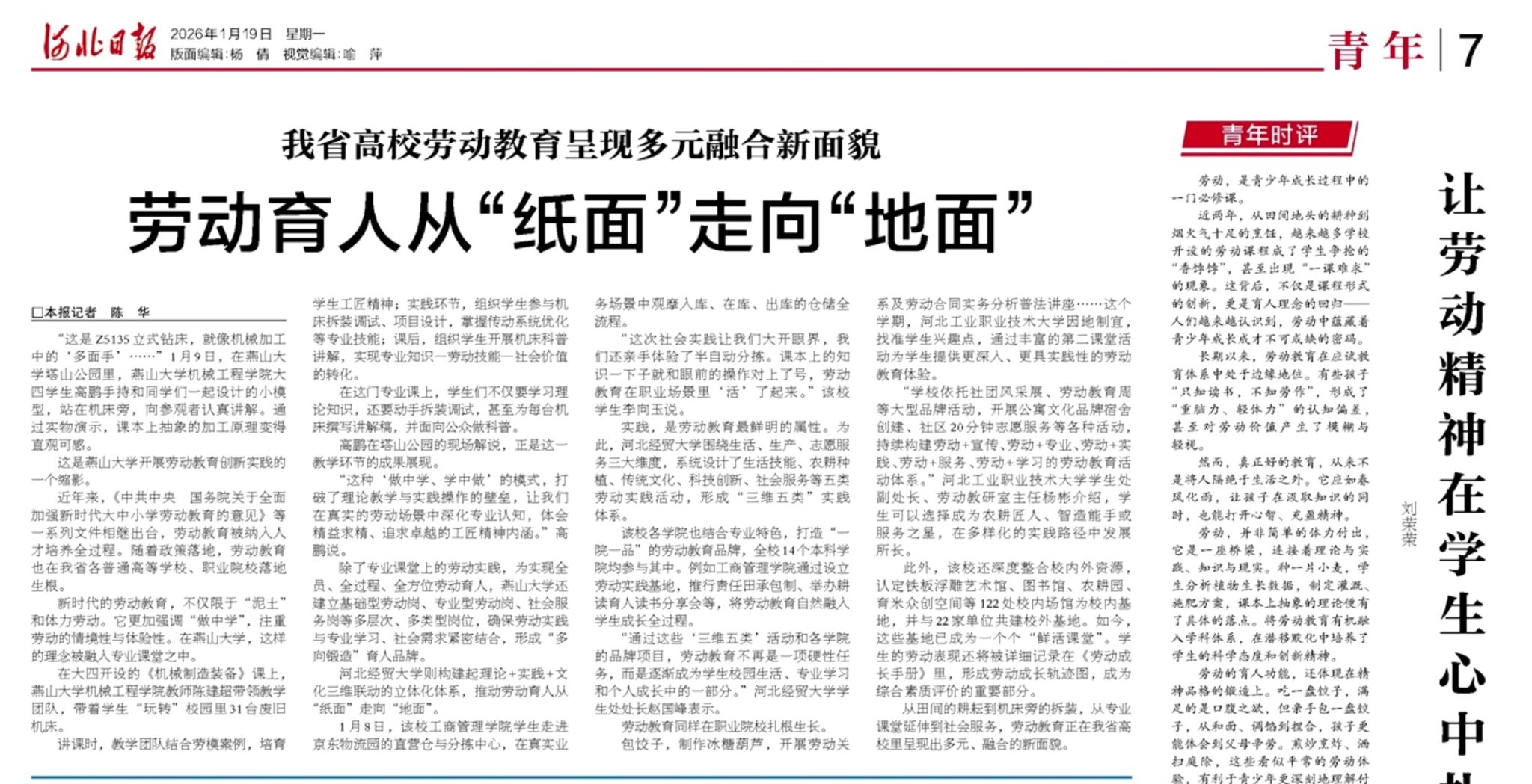 【新聞中心訊】近日,《河北日?qǐng)?bào)》在題為《我省高校勞動(dòng)教育呈現(xiàn)多元融合新面貌 勞動(dòng)育人從“紙面”走向“地面”》的綜合報(bào)道中,重點(diǎn)報(bào)道了燕山大學(xué)機(jī)械工程學(xué)院《機(jī)械制造裝備》課程以“科普公益勞動(dòng)”為載體,深化“專業(yè)+勞動(dòng)”融合育人的創(chuàng)新實(shí)踐。報(bào)道生動(dòng)展示了燕山大學(xué)將31臺(tái)廢舊機(jī)床轉(zhuǎn)化為教學(xué)資源,構(gòu)建“理論-實(shí)踐-公益服務(wù)”一體化育人模式的特色經(jīng)驗(yàn),標(biāo)志著燕山大學(xué)在推動(dòng)勞動(dòng)教育與專業(yè)教育深度融合方面取得階段性成果,形成可復(fù)制、可推廣的育人新范式。