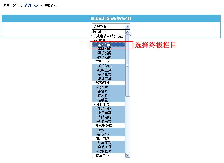 | 2、“選擇要增加采集的欄目”(選擇終極欄目); |