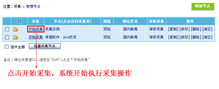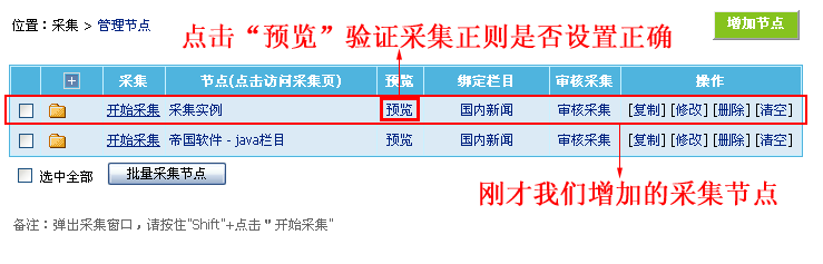 | 1、上面增加采集節(jié)點后,我們返回“管理節(jié)點”頁面,如下: |