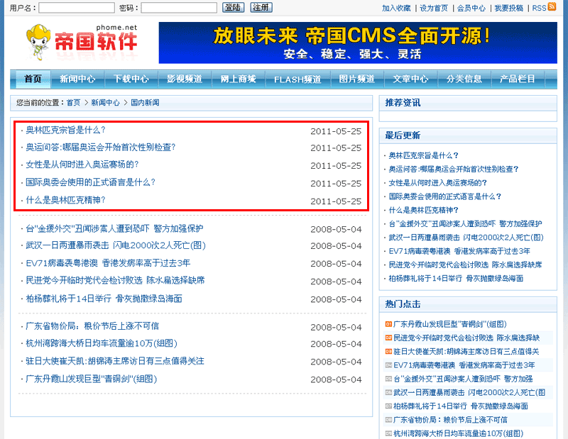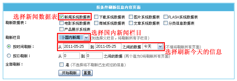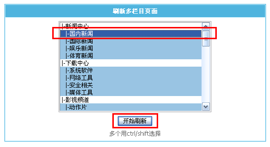 | 2、生成欄目頁:“刷新多欄目頁面”選擇“國內新聞”這個欄目,然后點擊“開始刷新”。 |