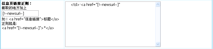 | (4)、設置“信息頁鏈接正則”:由列表頁的源代碼得出。 |