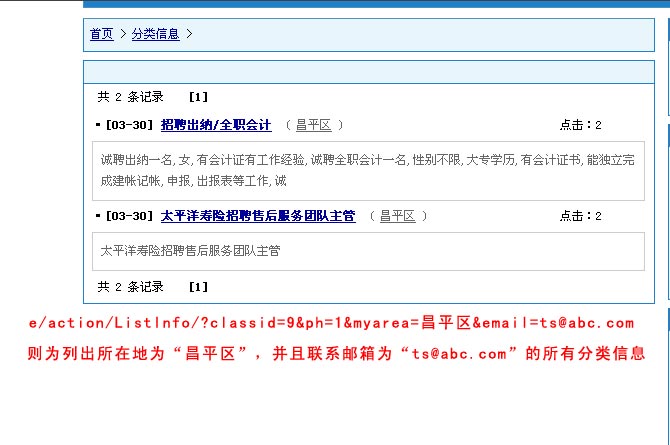 方式,模糊匹配則只要包含字符值即可符合條件。例:“e/action/ListInfo/?classid=9&ph=1&email=abc.com”就能列出郵箱地址中包含“abc.com”字符的的所有分類信息。