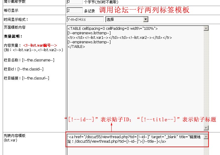 標(biāo)簽語(yǔ)法例子:(僅需設(shè)置紅色部分) [ecmsinfo]'select 貼子標(biāo)題字段 as title,貼子ID字段 as id from 貼子數(shù)據(jù)表 order by 排序字段 desc limit 調(diào)用條數(shù)',0,標(biāo)題截取字?jǐn)?shù),0,24,模板ID,0[/ecmsinfo] 例如:(調(diào)用論壇最新10個(gè)貼子) DISCUZ論壇:[ecmsinfo]'select subject as title,tid as id from cdb_threads order by tid desc limit 10',0,30,0,24,1,0[/ecmsinfo] PHPWIND論壇:[ecmsinfo]'select subject as title,tid as id from pw_threads order by tid desc limit 10',0,30,0,24,1,0[/ecmsinfo] (說(shuō)明:如果論壇跟帝國(guó)CMS安裝在不同的數(shù)據(jù)庫(kù),“貼子數(shù)據(jù)表”用“數(shù)據(jù)庫(kù).數(shù)據(jù)表”表示,如“discuzdb.cdb_threads”.)