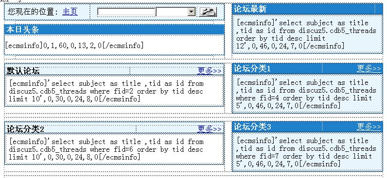 原理說(shuō)明: 通過(guò)ecmsinfo標(biāo)簽與按SQL調(diào)用相結(jié)合實(shí)現(xiàn)論壇數(shù)據(jù)調(diào)用。