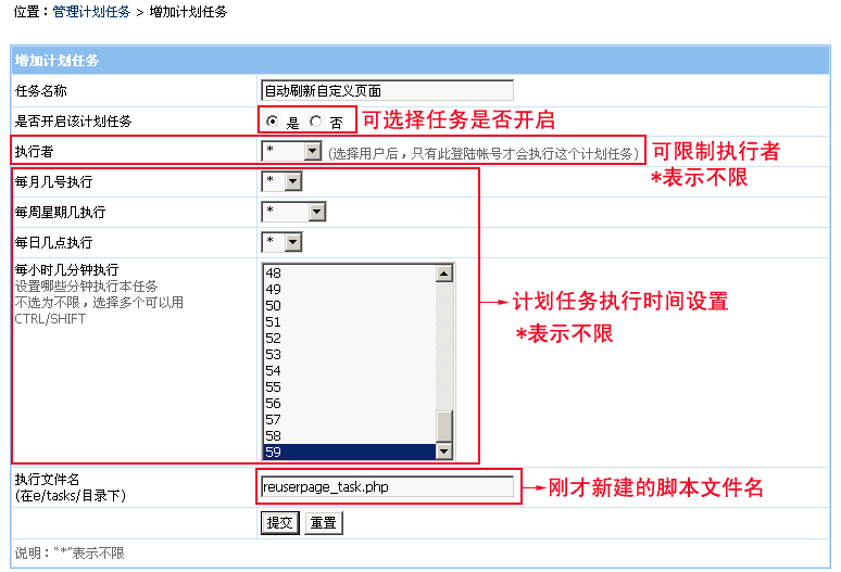 任務(wù)名稱:自動(dòng)刷新自定義頁(yè)面 執(zhí)行腳本設(shè)為:reuserpage_task.php 說(shuō)明:上面例子我把執(zhí)行時(shí)間設(shè)為每個(gè)小時(shí)的59分鐘時(shí)執(zhí)行。