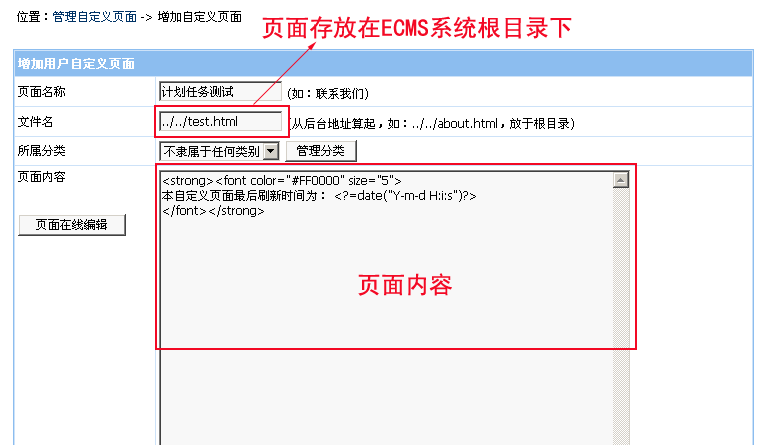 2、開(kāi)啟模板支持程序代碼后,點(diǎn)擊“模板管理”->“增加自定義頁(yè)面”,進(jìn)行自定義頁(yè)面增加: 頁(yè)面名稱:計(jì)劃任務(wù)測(cè)試 文件名:../../test.html 頁(yè)面內(nèi)容: