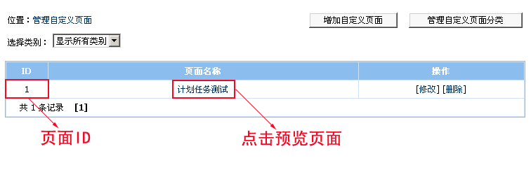 說(shuō)明:上面腳本代碼中我們?cè)O(shè)定刷新自定義頁(yè)面id=1的頁(yè)面,依自己的情況修改上面的自定義頁(yè)面ID列表。