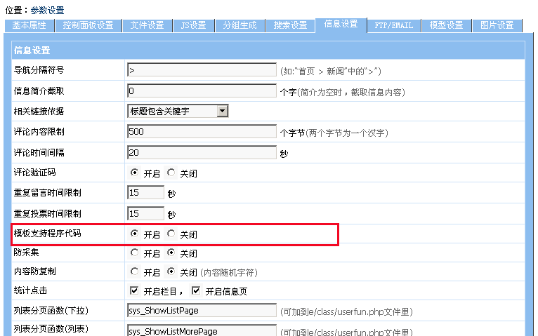 二、接著我們?cè)黾觽€(gè)自定義頁(yè)面,供待會(huì)兒增加任務(wù)時(shí)使用: 1、因?yàn)槲覀兝又性黾拥淖远x頁(yè)面要加入php代碼輸出最后刷新頁(yè)面的時(shí)間,所以我們要先開(kāi)啟模板支持程序代碼,開(kāi)啟方法如下: 登陸后臺(tái)->“系統(tǒng)設(shè)置”->“系統(tǒng)參數(shù)設(shè)置”->“信息設(shè)置”,將“模板支持程序代碼”項(xiàng)設(shè)為開(kāi)啟,然后提交。如下圖: