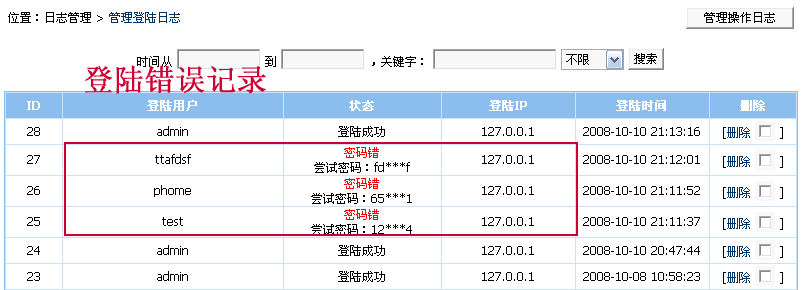 登錄錯誤日志記錄,使用戶第一時間檢查非法登錄IP,做出及時的非法IP封鎖。下圖為查看記錄: