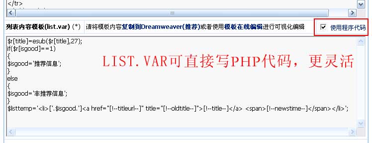 1、增加模板時list.var模板需要勾選“使用程序代碼”選項。如圖: