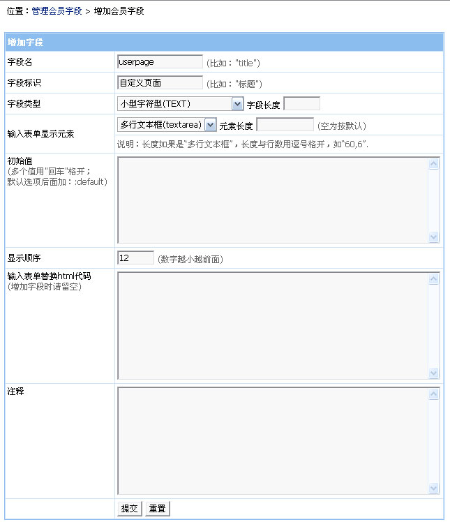 說明:上圖增加的字段名為userpage的會員字段