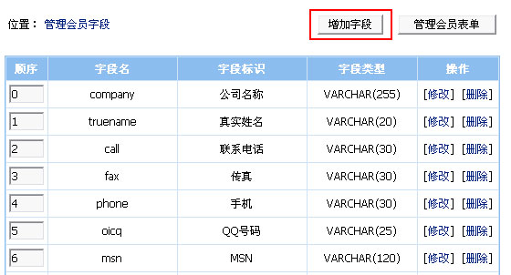 1、到“用戶面板”->“管理會員字段”->點擊“增加字段”按鈕,如下圖: