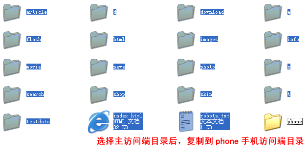 一般在主訪問(wèn)端下建個(gè)子目錄就可以。比如:在帝國(guó)CMS根目錄下建“phone”目錄來(lái)做手機(jī)訪問(wèn)端目錄。