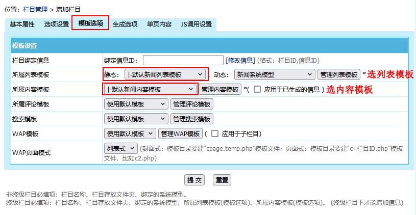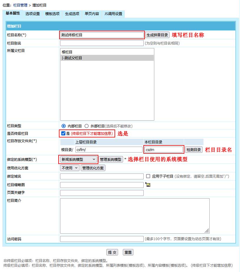 :下面沒(méi)有子欄目的欄目,此類型欄目為信息列表頁(yè)、綁定信息,終級(jí)欄目下方可增加信息。
