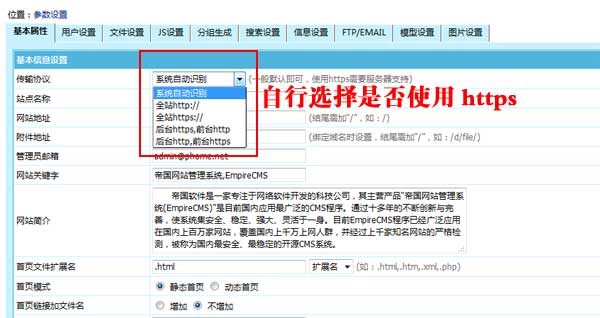 帝國(guó)CMS7.5版可自行靈活選擇是否使用HTTPS: 1、支持由系統(tǒng)自動(dòng)識(shí)別當(dāng)前服務(wù)器是否使用HTTPS。