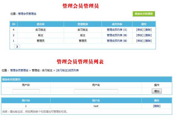 1、默認(rèn)增加管理員與版主兩個(gè)管理組,也可以自行增加管理組、組名稱自定義。