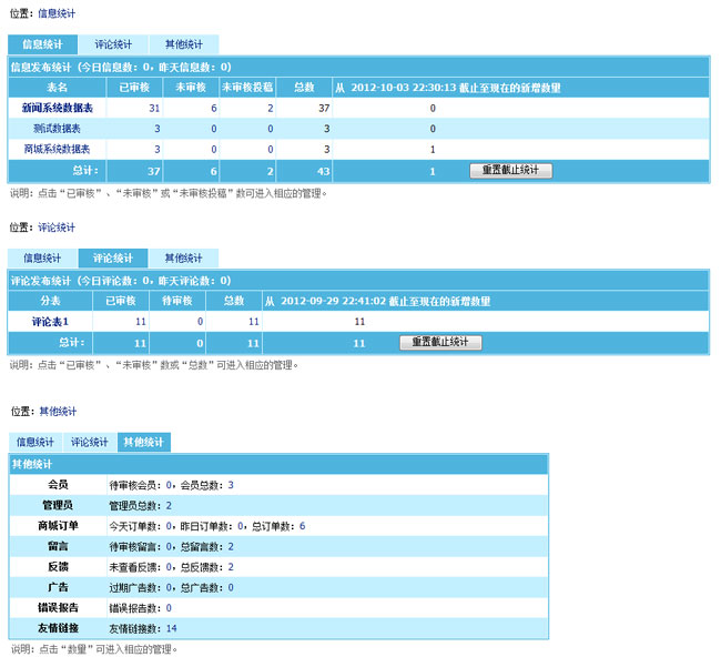 帝國CMS7.0新增統(tǒng)計(jì)最新信息與評論數(shù)量,讓管理員更方便了解最新狀況:
