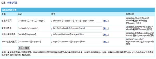 支持設(shè)置信息內(nèi)容頁(yè)、欄目頁(yè)、標(biāo)題分類(lèi)頁(yè)、TAGS列表頁(yè)及各分頁(yè)偽靜態(tài)設(shè)置。