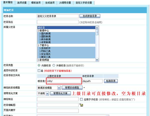 帝國CMS 6.6版欄目支持直接自定義上級(jí)存放目錄,更靈活。至此欄目上級(jí)目錄、專題上級(jí)目錄和內(nèi)容頁存放目錄都可以自定義。