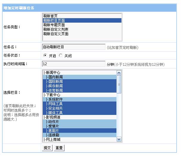 V6.0定時(shí)生成支持生成首頁(yè)、欄目頁(yè)、專題頁(yè)、自定義列表、自定義頁(yè)面,并且支持多選。