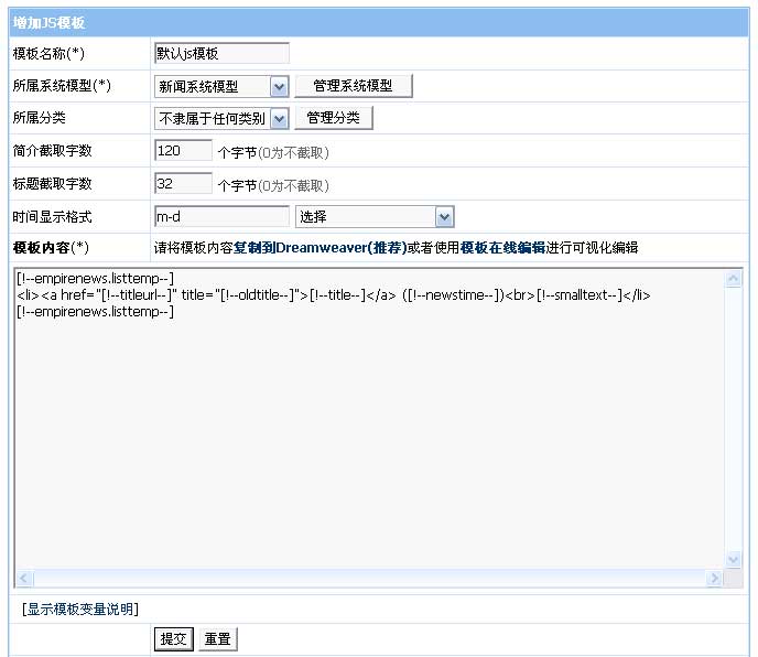 帝國(guó)CMS模板調(diào)用一直都支持標(biāo)簽調(diào)用與JS調(diào)用,先前版本JS調(diào)用不支持調(diào)用自定義字段,只支持調(diào)用title、newstime、writer等固定變量,為了使JS調(diào)用更加靈活,V6.0對(duì)此功能進(jìn)行了升級(jí),已經(jīng)支持調(diào)用所有自定義字段,并且支持同ecmsinfo標(biāo)簽?zāi)0逡粯拥母郊幼兞?,更加靈活。截取字?jǐn)?shù)及日期格式直接在模板里設(shè)置,不需要修改每個(gè)欄目的設(shè)置,更方便。