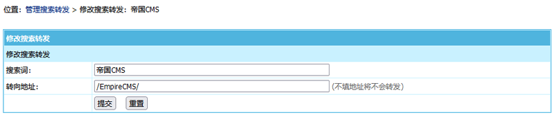 帝國CMS8.0版新增搜索轉(zhuǎn)發(fā)功能,可以指定某搜索關(guān)鍵詞轉(zhuǎn)到指定頁面: